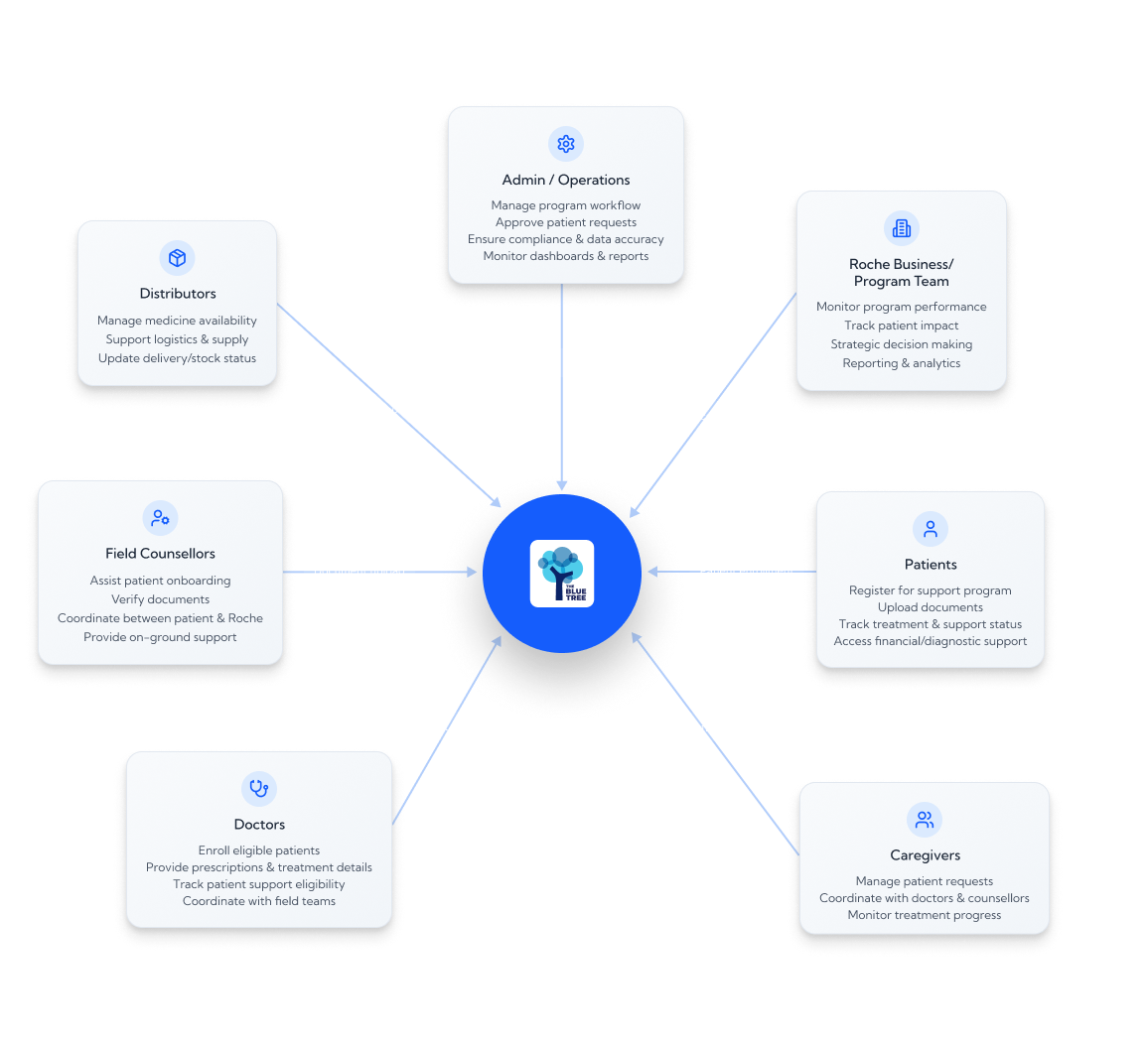 Enable seamless coordination between patients, doctors, counsellors, distributors, and admin